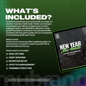 Save time and elevate your service with our ready-to-use New Year New Habit Guide. Perfect as a lead gen or to support your clients’ programmes, it covers training, nutrition, and lifestyle for effective muscle growth. No need to create your own just personalise and send. This ever green guide can be re-purposed to suit building habits year round.