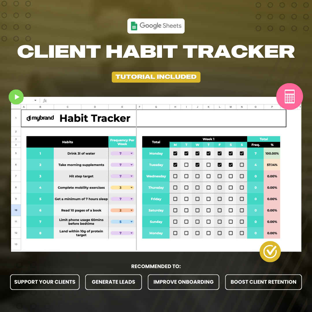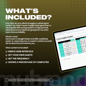 How often do your clients struggle to uphold good habits? Our Habit Tracker Google Sheet gives them a visual guide with scoring system to help promote adherence to any habits set giving them an extra layer of accountability.