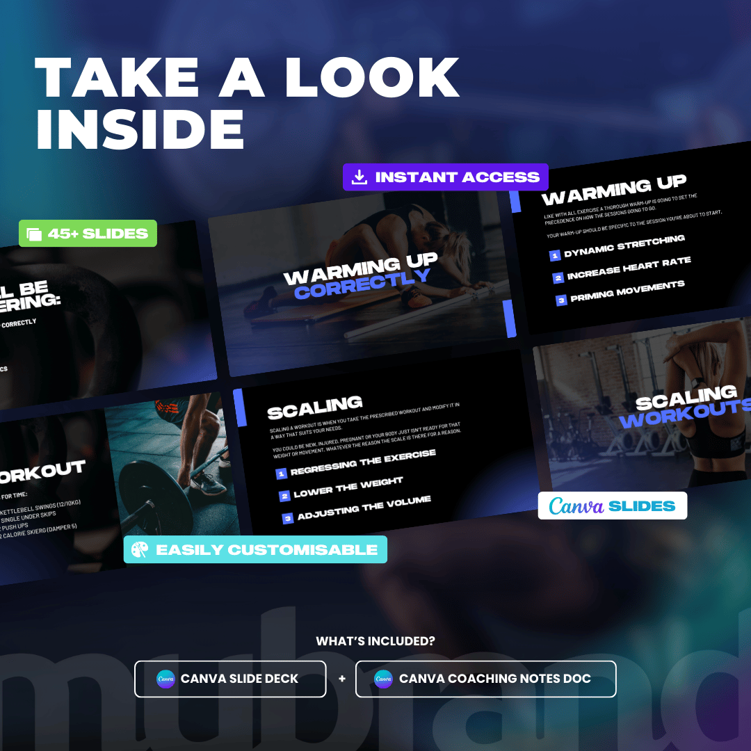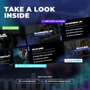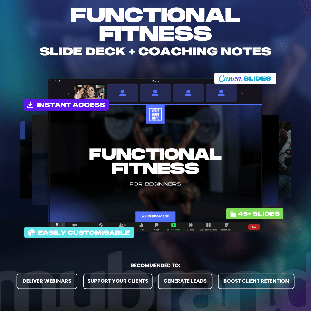 Don’t have time to create professional looking presentations? This done-for-you slide deck is an educational deliverable that you can offer as a lead generation tool, or a client resource. This slide deck is done for you covering your check in process. This slide deck pulls information from our popular ‘Functional Fitness For Beginners‘.