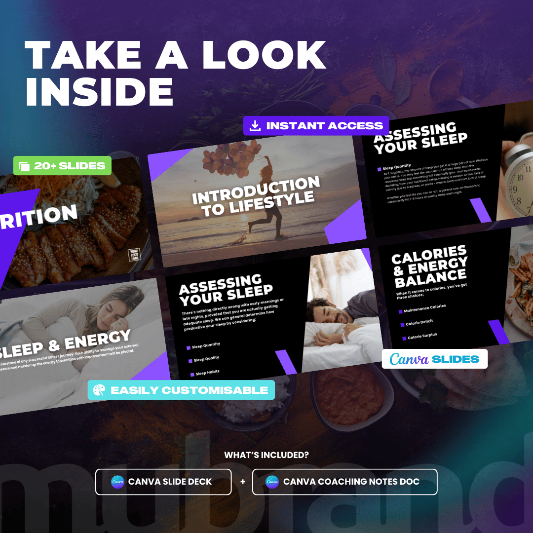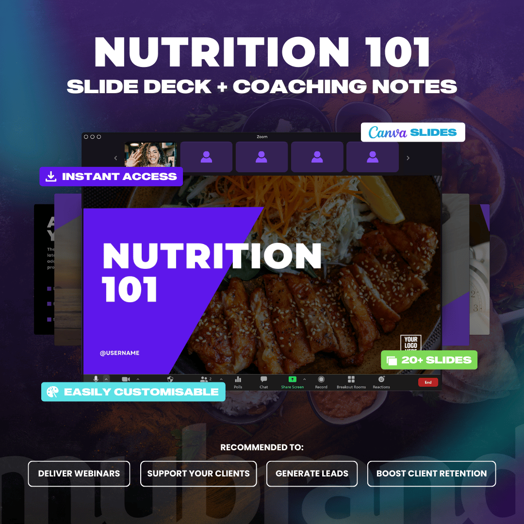 Don’t have time to create professional looking presentations? This done-for-you slide deck is an educational deliverable that you can offer as a lead generation tool, or a client resource. This slide deck is done for you covering your check in process. This slide deck pulls information from our popular ‘Nutrition 101 Guide‘.